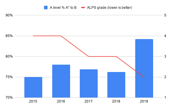 The chart below shows the % grades awarded A* to B in the past 5 years of A-level results for Tiffin School Physics department.