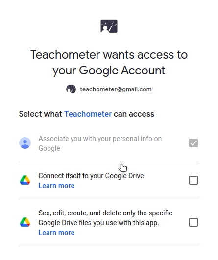 This allows you to open Teachometer files from within Google Drive. This does not grant Teachometer access to any of your drive files. | |